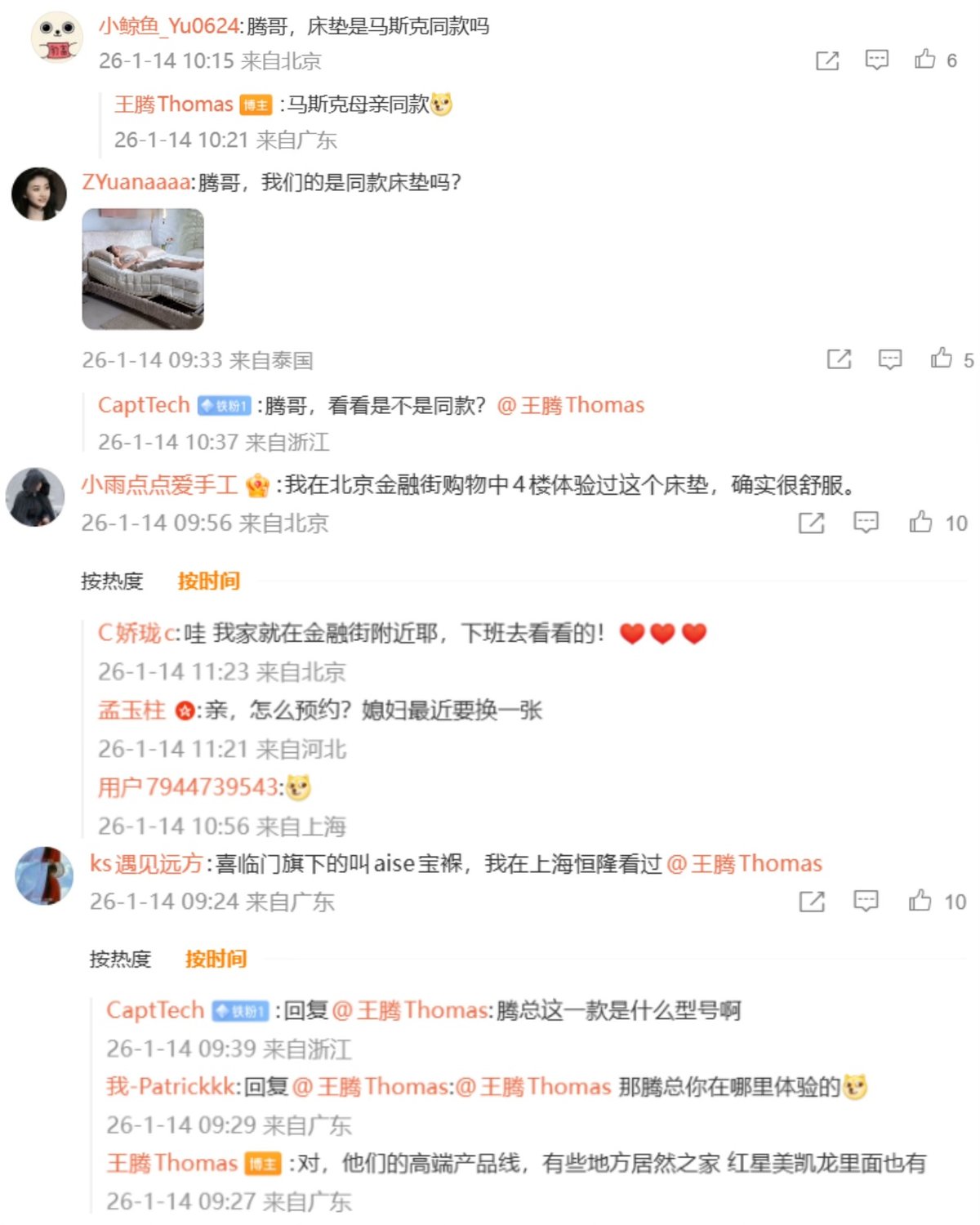 这一评价让不少网友在评论区追问具体型号。有人好奇是否是梅耶·马斯克同款,也有眼尖粉丝认出是喜临门高端AI床垫品牌aise宝褓,并强调“在上海恒隆看过”。还有网友表示在北京金融街购物中心4楼体验过这个床垫,“确实很舒服”。甚至还有身在泰国的网友赶来求证是否用的是王腾同款。